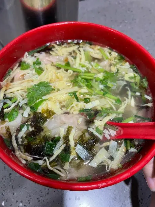 大馅馄饨荠菜鲜肉馅鲜掉眉毛,皮薄馅足,汤头撒上葱花虾皮,鲜到本色里,再来份炸猪排蘸辣酱油,绝配。