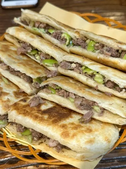 刚出炉的驴肉火烧酥到掉渣!火烧外表脉络分明,内部夹着鲜活的驴肉和焖子,咬一口肉香四溢,配碗驴杂汤暖乎乎超餍足。