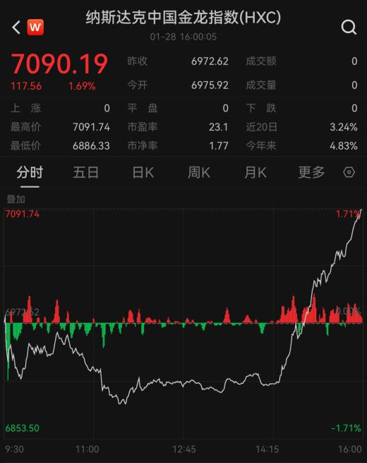 热点中概股大批高涨,纳斯达克中国金龙指数(HXC)涨1.69%。
