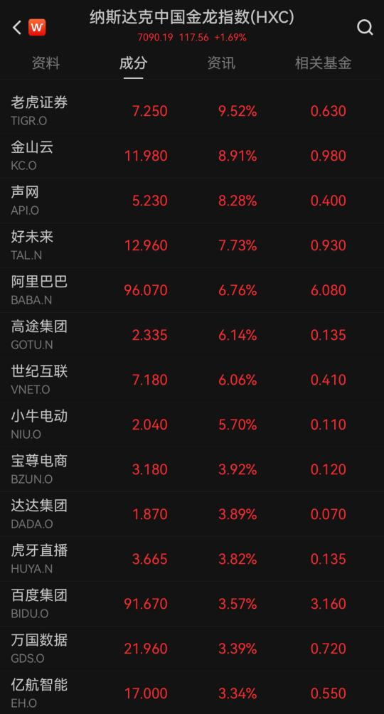 Wind数据暴露,指数身分股中,老虎证券大涨9.52%,金山云、好未来、阿里巴巴、高途集团、世纪互联、小牛电动等涨超5%,虎牙直播、百度集团、万国数据等涨超3%。