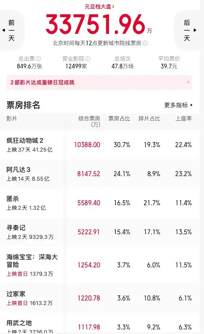 望望昨天的单日票房吧,总票房是3.3亿,其中,《豪恣动物城2》就拿了1个亿,这一部上映了一个多月的电影,目下还能这样强势,确实是始料未及啊。