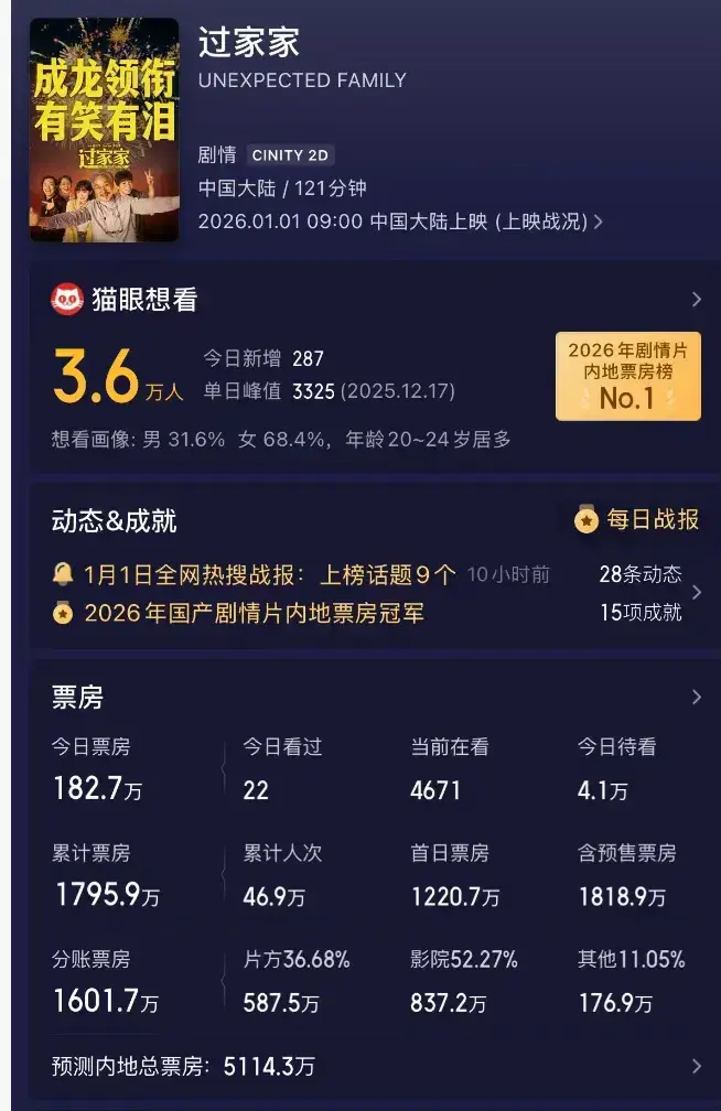 因此,成龙的《过家家》拿了一千多万亦然不出预念念的,因为这一部电影的热度太低,就连10%的排片都莫得撑得起。