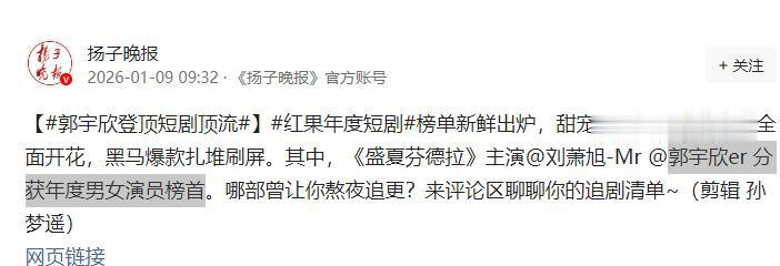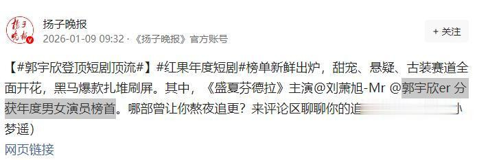 就在昨天,官媒发文报说念郭宇欣凭借《盛夏芬德拉》成为了红果短剧年度女演员的榜首。