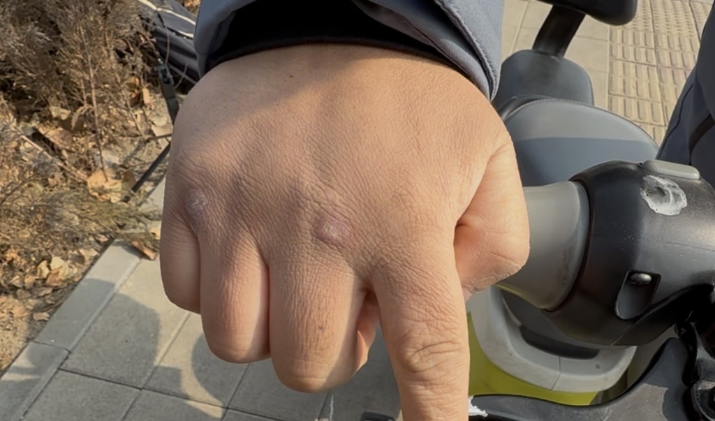 2026年1月30日,曹先生展示右手手背浮现,距事发仍是两个多月,右手手背两个伤口均留住疤痕。