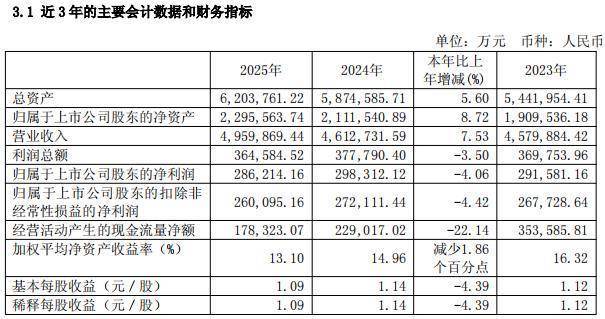 2023年,公司竣事利润总和36.98亿元,归母净利润29.16亿元;2024年,公司利润总和进一步晋升至37.78亿元,同比增长2.17%,归母净利润达到29.83亿元,同比增长2.31%;参加2025年,公司利润总和回落至36.46亿元,同比减少3.50%,归母净利润和扣非后净利润别离为28.62亿元和26.01亿元,同比别离下降4.06%和4.42%。